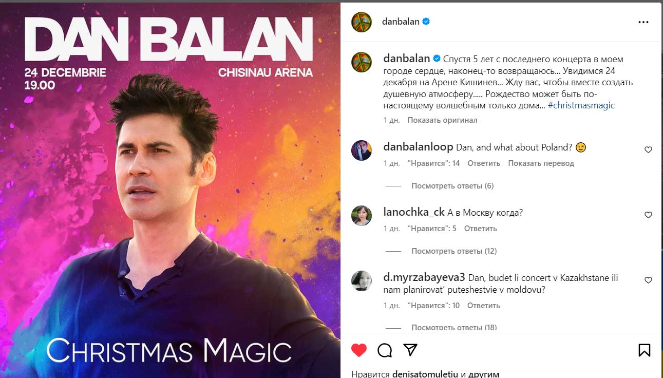 Тепер же Дан Балан сповістив підписникам, що повертається. Звісно, мова йде не про Київ, а про рідний Кишинів. Музикант анонсував концерт у столиці Молдови 24 грудня на “Арені Кишинів”, хоча до цього не виступав на батьківщині довгих 5 років.