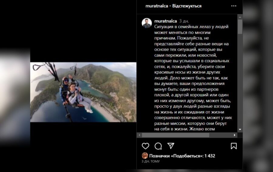 Не відстає і сам чоловік – він також видалив усі фотографії зі своєю обраницею. Втім, на відміну від Лілії Реус, Мурат залишив весільні кадри. Разом із тим, в описі до особистого блогу чоловіка раптово зник статус одруженого. Раніше Налчаджиоглу написав у біографії в популярній соцмережі, що перебуває у шлюбі. Тепер же цієї інформації не знайти