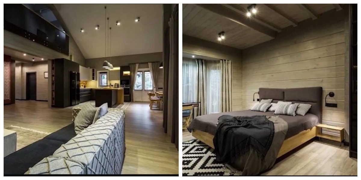 Власне, будинок актриси площею приблизно 300 квадратних метрів побудовано загалом з дерева, має 2 поверхи: на першому кухня з вітальнею, а на другому кімнати дітей та Олени з чоловіком.