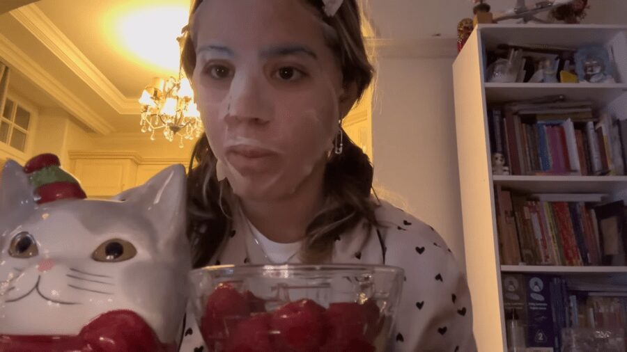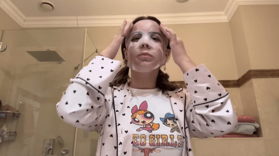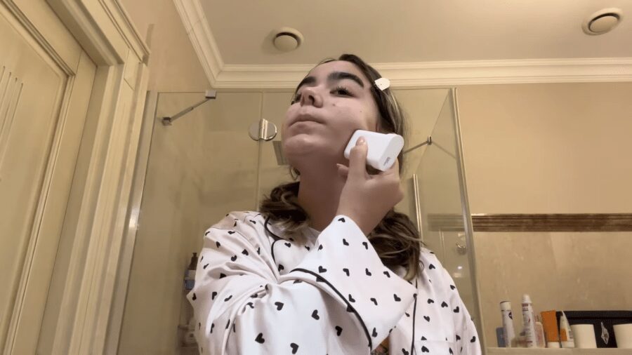 Після так званого сніданку Софія знову направилася у ванну, де продовжила свою б’юті-рутину. Знявши тканинну маску, Соня очистила обличчя за допомогою пінки для вмивання. Далі дівчинка нанесла тонізуючий тонік, сироватку для обличчя, а поверх цього – крем для обличчя. Та і на цьому Соня не зупинилася і нанесла ще один крем з SPF, який захищає від сонця.