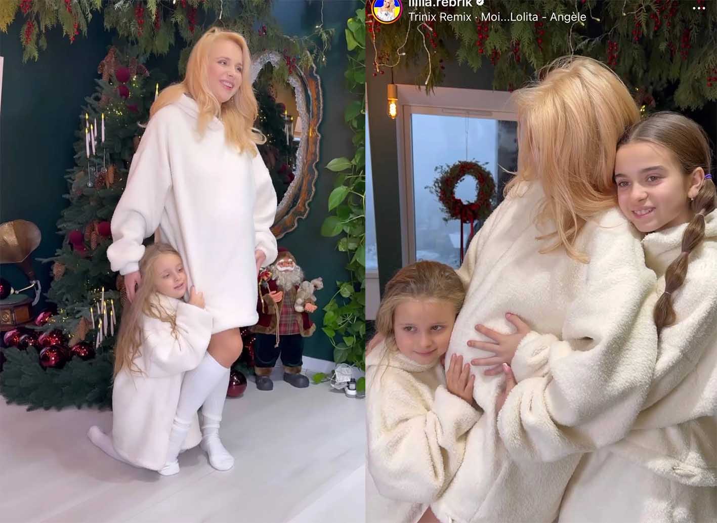 Мама й дівчатка вбралися у білі светри оверсайз та такі ж чобітки. Й нумо витанцьовувати під по-святковому вбраною ялинкою. Лілія Ребрик, зважаючи на очікування третьої дитинки, живіт сховала під м’якими складками тканини. А от коліна не посоромилася виставити напоказ: