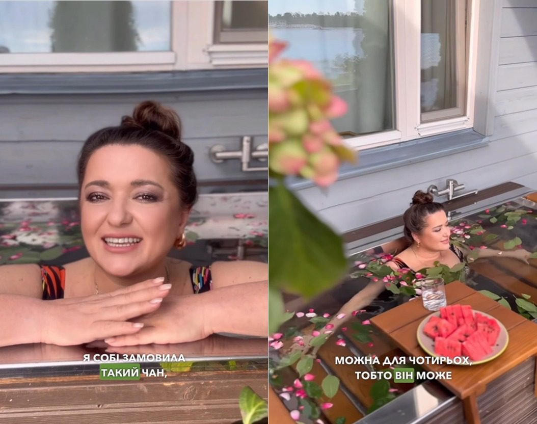 Наталка тут же набрала повний чан водички, насипала туди рожевих пелюсток, підлила молодильного відвару й занурилася по саму шию. Справжня райська насолода! Оскільки місця в артистки на обійсті не дуже багато, то вона обрала місткість на двох, а не на чотирьох.