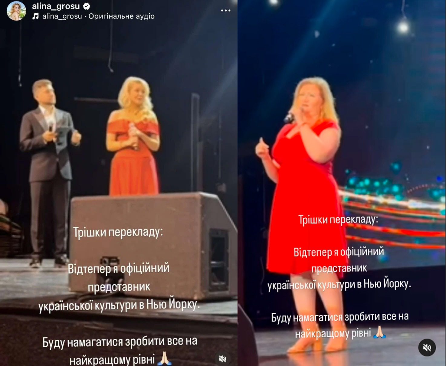 Тим часом на відео, розповсюджене Аліною в Інстаграмі, жінка у червоній сукні оголошує саме про те, що Гросу віднині є офіційною представницею української культури в Нью-Йорку. До речі, сама співачка назвала цю ораторку головою з дипвідносин між Америкою та рештою країн ООН.