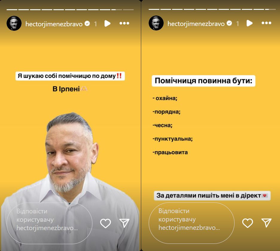Зірка “МастерШефу” Ектор Хіменес-Браво опублікував в Інстаграм-сторіз оголошення. З’ясувалося, що чоловік підшукує для себе жінку, але не для любовних утіх, а щоб була помічницею по дому. Вимоги до кандидатки на цю роль 52-річний українець колумбійського походження висуває доволі серйозні: