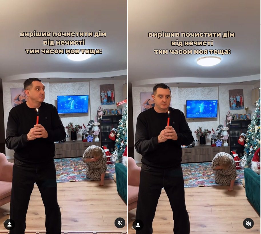 Дядя Жора показався зі свічкою в руках на тлі житлової кімнати. Усе як годиться перед Різдвом – телевізор, диван з Санта-Клаусом, ошатно вбрана ялинка. Ось тільки сам глава родини чомусь стоїть розгублений з запаленою свічкою в руках. І підпис: