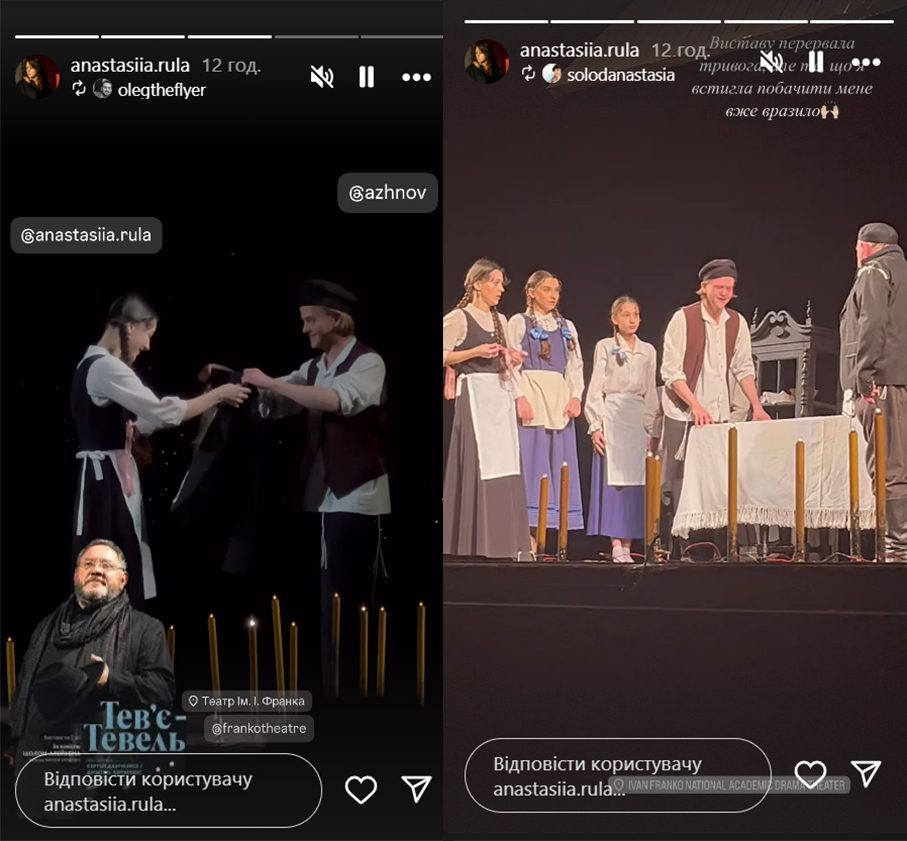 Акторка залучена у “Тев’є-Тевель” Шолом Алейхема у ролі Цейтл. Тож поділилася незабутніми враженнями від вистави та прикрістю, що просто під час дійства довелося перервати гру через повітряну тривогу. В’ячеславу у цій постановці дісталася роль Мотла.