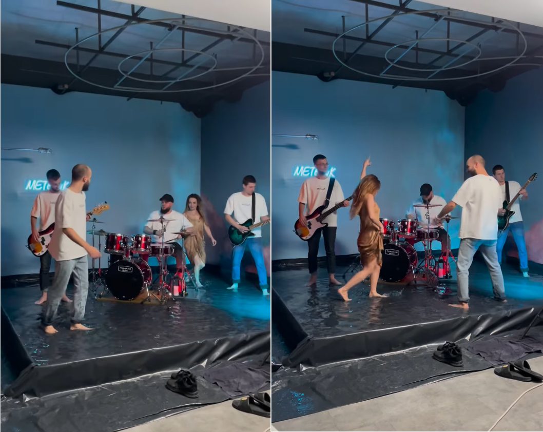 Вікторія Булітко з нареченим Кирилом Поповичем вирішили вразити шанувальників виступом гурту METELyK. А щоб він запам'ятався, просто на підлогу налили води й влаштували мокрі танці.