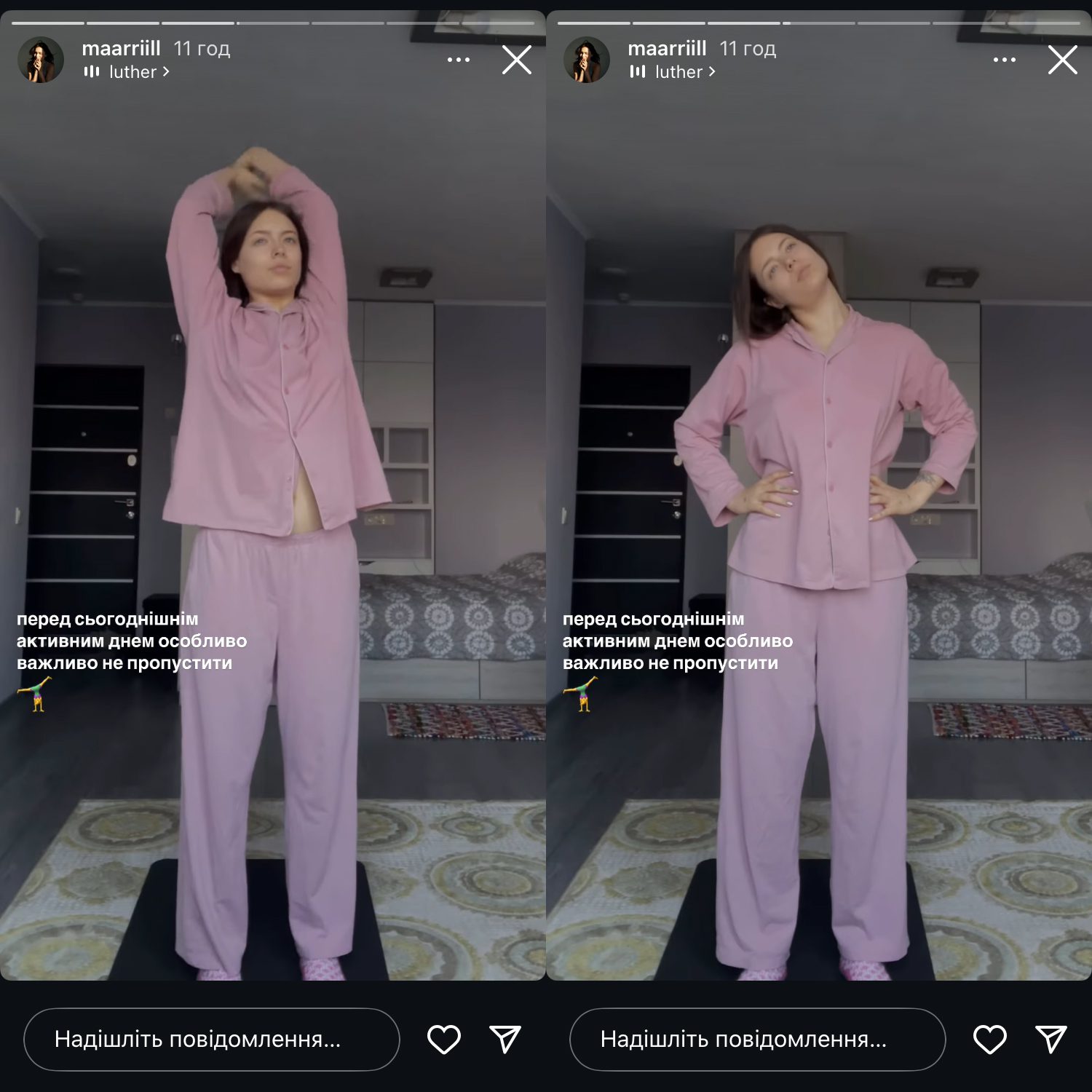 Схоже, що розміри квартири мікроскопічні. Марія показала, як робить ранкову гімнастику у піжамі, то можемо побачити шматок двоспального ліжка, білу шафу вздовж стіни й… вхідні двері. Та закоханим, певно, байдуже. Недарма ж придумали поговірку, що “з милим рай і у шалаші”.