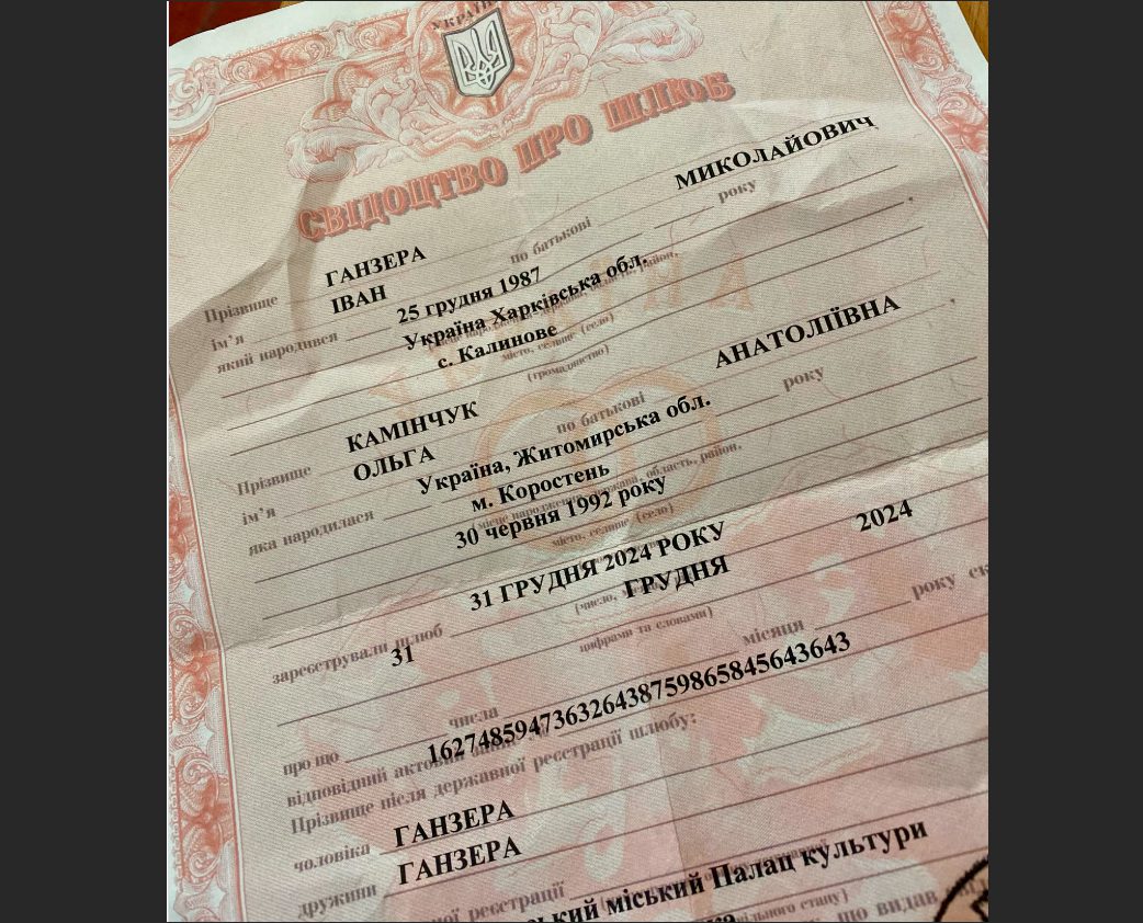 Відтепер Ольга Камельчук офіційно стала Ольгою Ганзерою. Дружина Івана Ганзери виклала в мережу Свідоцтво про шлюб, датоване 31 грудня 2024 року. Якщо вірити паперу, побралася пара, яка вже разом 13 років, у Коростені. Ще й написала: