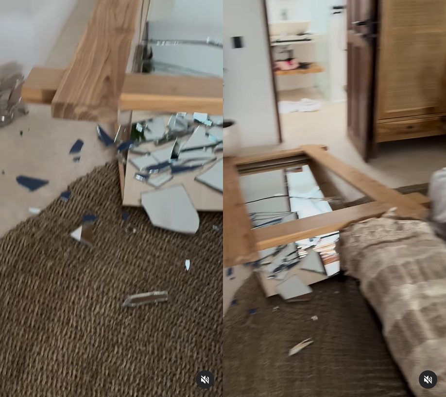 Така неприродна поза Анни Трінчер пояснюється надзвичайною подією, яка відбулася у номері артистки. Річ у тім, що на дівчину звалилося дзеркало у величезній дерев’яній рамі та розбилося на друзки. Ролик з уламками знаменитість підписала так: