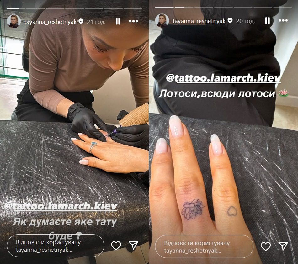 Tayanna показала процес набиття малюнка. Схоже, артистка залишилася вдоволеною роботою тату-майстрині. Тільки незрозуміло, що тепер робитиме пані Тетяна у разі нової закоханості – куди вдягатиме обручку?