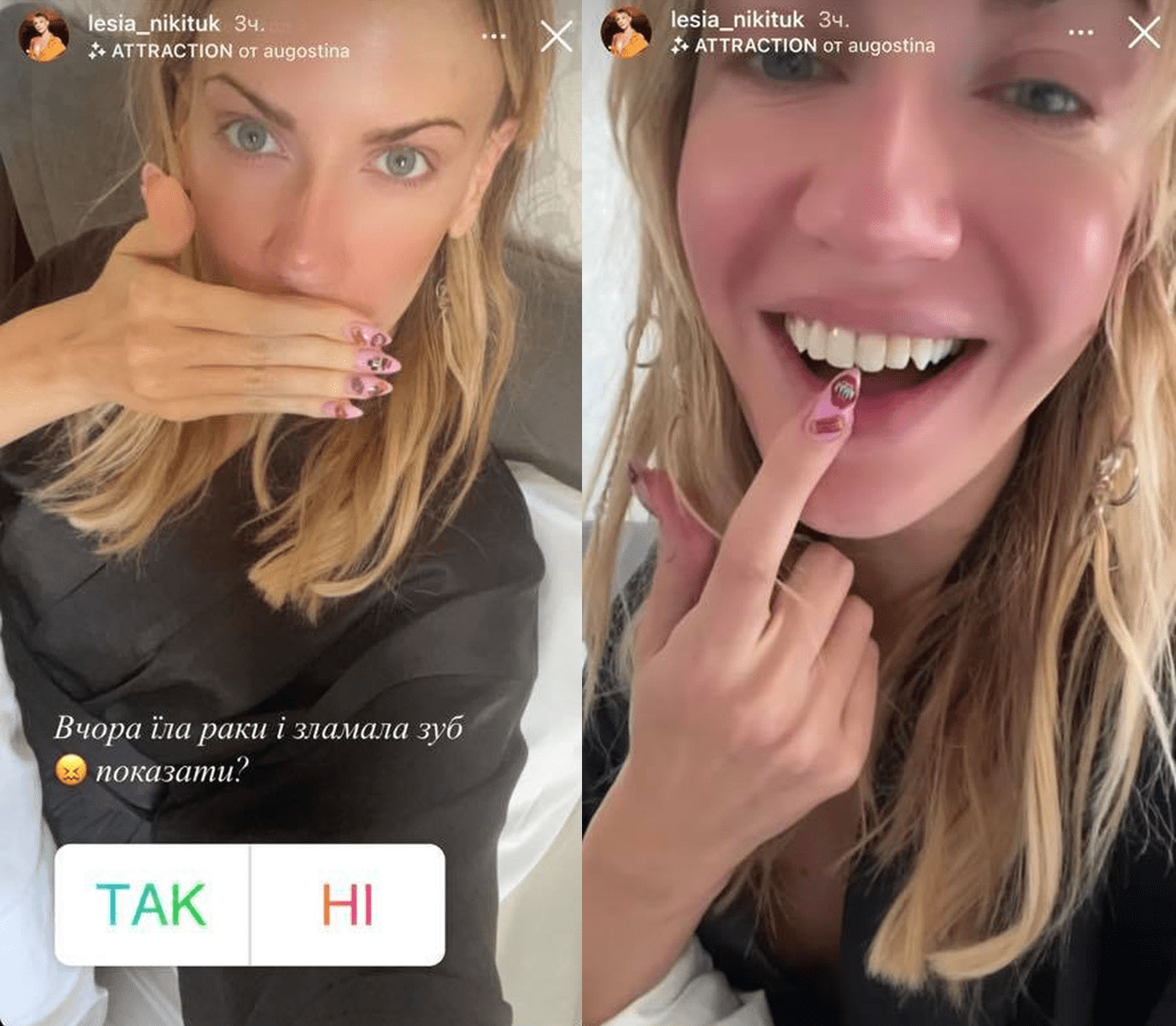 З телеведучою щось подібне трапилося восени 2021 року. Білявка мала намір поласувати вареними раками, натомість отримала головний біль, вірніше, зубний. Відкололася часточка зуба просто спереду. Тож довелося вирушати до стоматолога, аби врятувати чарівну посмішку зірки.