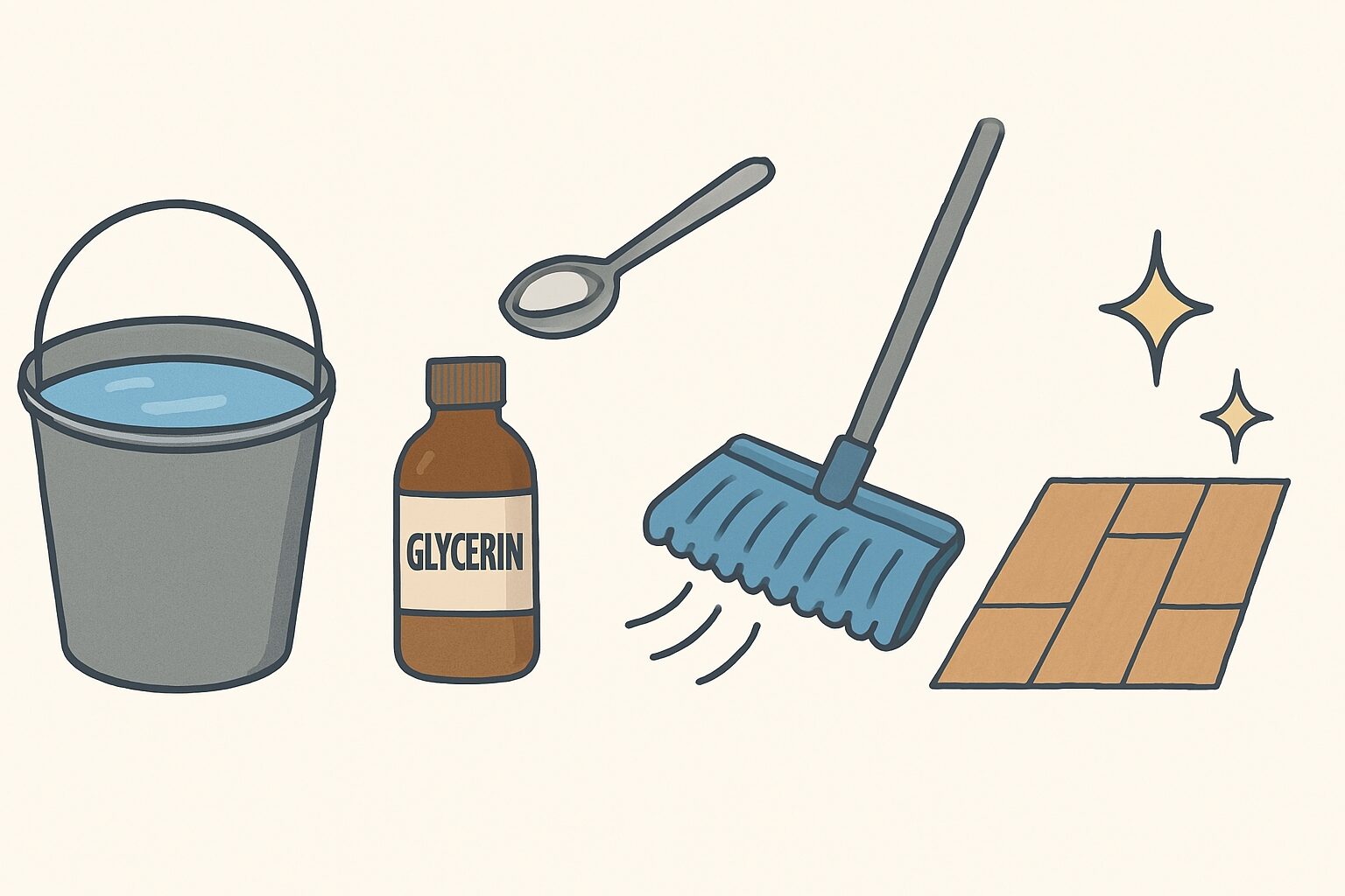 Воду треба брати трішки тепленьку. У 5-7 літрах розведіть 1 ст.лож. гліцерину. Далі все дуже просто – вмочаєте ганчірку в отриманий розчин і протираєте підлогу за допомогою швабри.