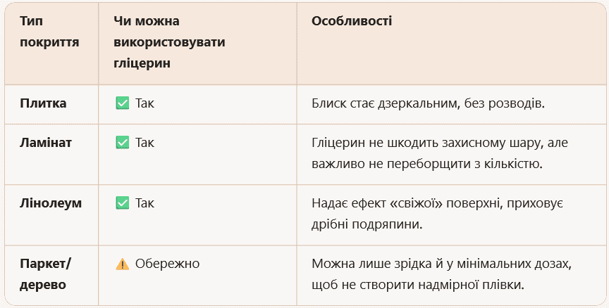 Якщо у воду для миття підлоги додати трішки гліцерину, утвориться зовсім тоненька невидима оку плівка, яка надасть поверхні блиску. Таким чином можна мити кахельну плитку, ламінат чи лінолеум.