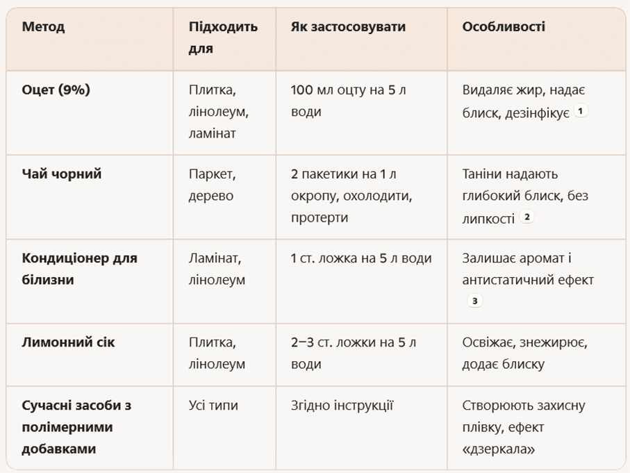 Існує кілька інших домашніх засобів, які теж здатні надавати підлозі блиск. Мова про чай, лимонний сік, оцет, кондиціонер для білизни. Але їх можна застосовувати не для всіх видів покриття.
