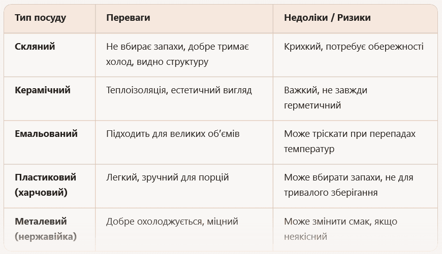 Окрім скляного та керамічного посуду, які не окиснюються і не змінюють смак страви, можете також використовувати емальовані місткості. Але переконайтеся, що на поверхні відсутні сколи, бо тоді метал вступить у реакцію з наїдком.