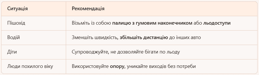 Кроки мають бути маленькими, а ступати слід на всю підошву відразу. У жодному разі не намагайтеся бігти. По можливості, тримайтеся за поручні, стіни чи паркани. І в жодному разі не панікуйте.