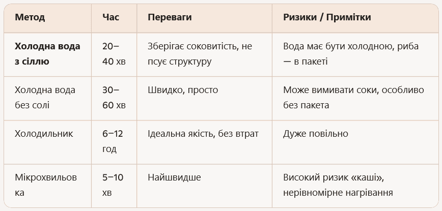Щоб процес рухався швидко, а філе чи цілі тушки залишалися щільними, недоцільно ставити рибу до мікрохвильової печі. У теплу воду теж продукт краще не класти, бо з цього не буде жодної користі.
