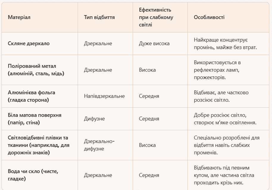 Краще за все впорається скляна поверхня дзеркала. Вона концентруватиме промінь практично без втрат. Полірована поверхня з алюмінію, сталі чи міді теж придасться. Саме цей матеріал використовують у рефлекторах прожекторів.