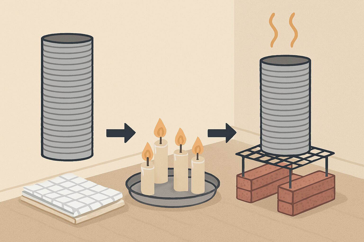 Якщо немає можливості створити складну конструкцію, яка здатна зігріти кухню, спробуйте хоча б підвищити температуру локально в одній з кімнат. Для цього знадобиться шматок гофрованої труби та свічки.