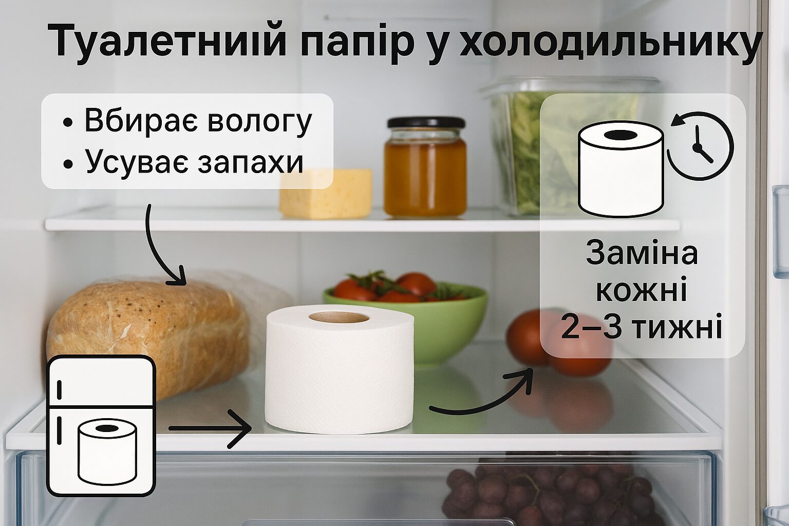 Боротися з надмірною вологою у холодильнику можна дуже простим способом. Покладіть на поличку рулончик туалетного паперу й забудьте про нього. Він не лише всю мокроту вбере в себе, але й втягне неприємні запахи від деяких продуктів.