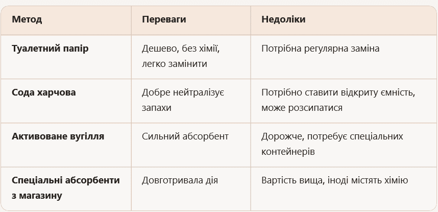 Якщо в середині перебуває рулон туалетного паперу, нічого цього не станеться – він усе всотає – і вологу, й неприємні запахи. Щоправда, за 2-3 тижні цей природний осушувач доведеться замінити на новий.