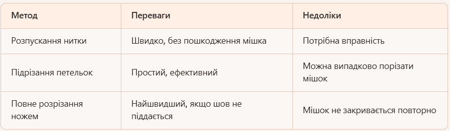 Не переплутайте нитку – тягніть з тонкого боку шва. Бо якщо почнете підтягувати з боку кіски, то не лише не відкриєте мішок, а ще й набагато тугіше затягнете прошивку. Якщо не зможете знайти кінчик нитки чи він виявиться занадто міцним і не буде піддаватися, тоді зробіть акуратний надріз у верхній частині мішка.