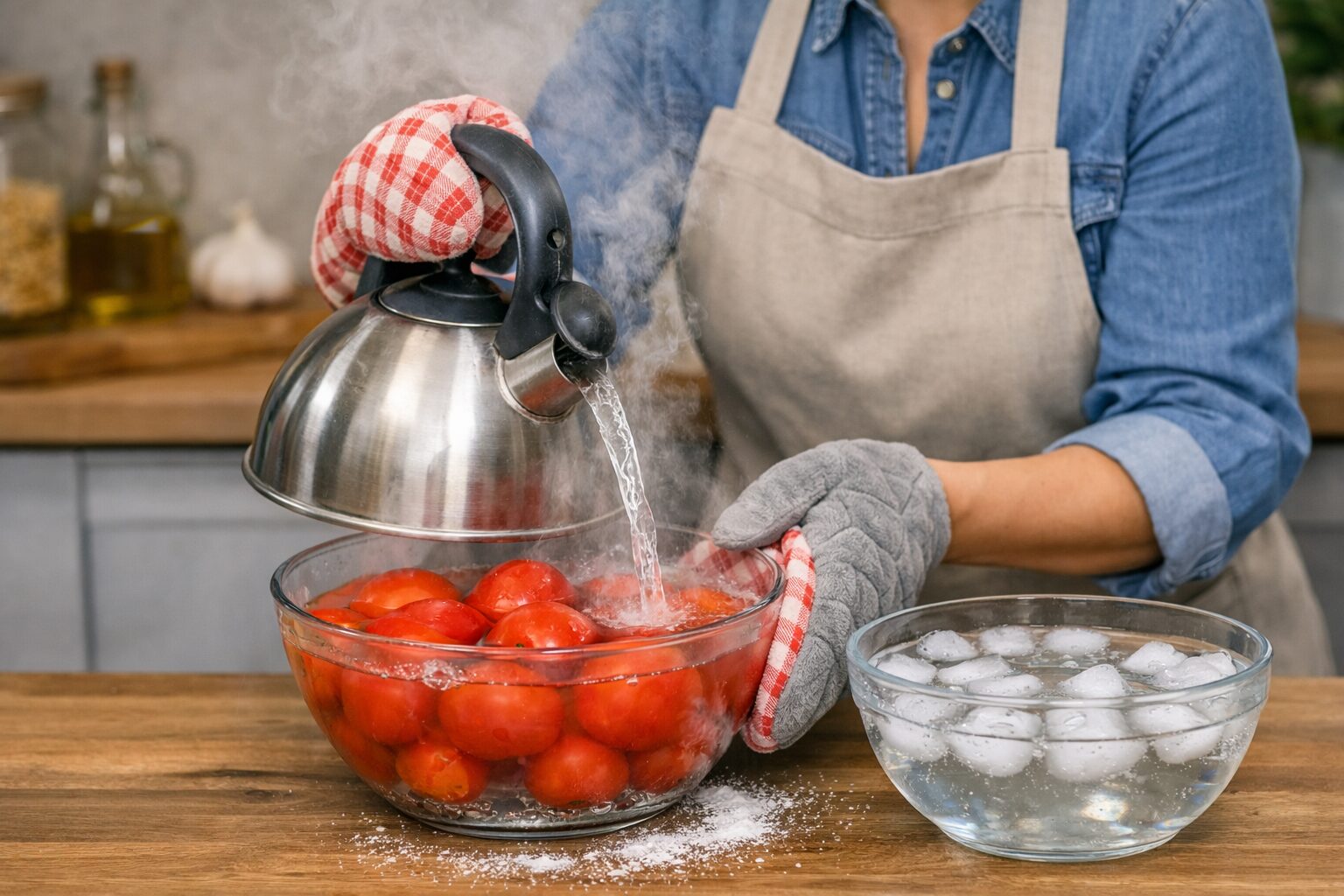 Якщо для рецепту вам потрібні томати без шкірочки, зняти її завжди проблематично. Але не тепер. Занурте овочі у крутий окріп на 30 секунд. Після цього дістаньте й відразу ж опустіть у мисочку з крижаною водою. Шкірочка відійде практично сама, вам не доведеться докладати зусиль.