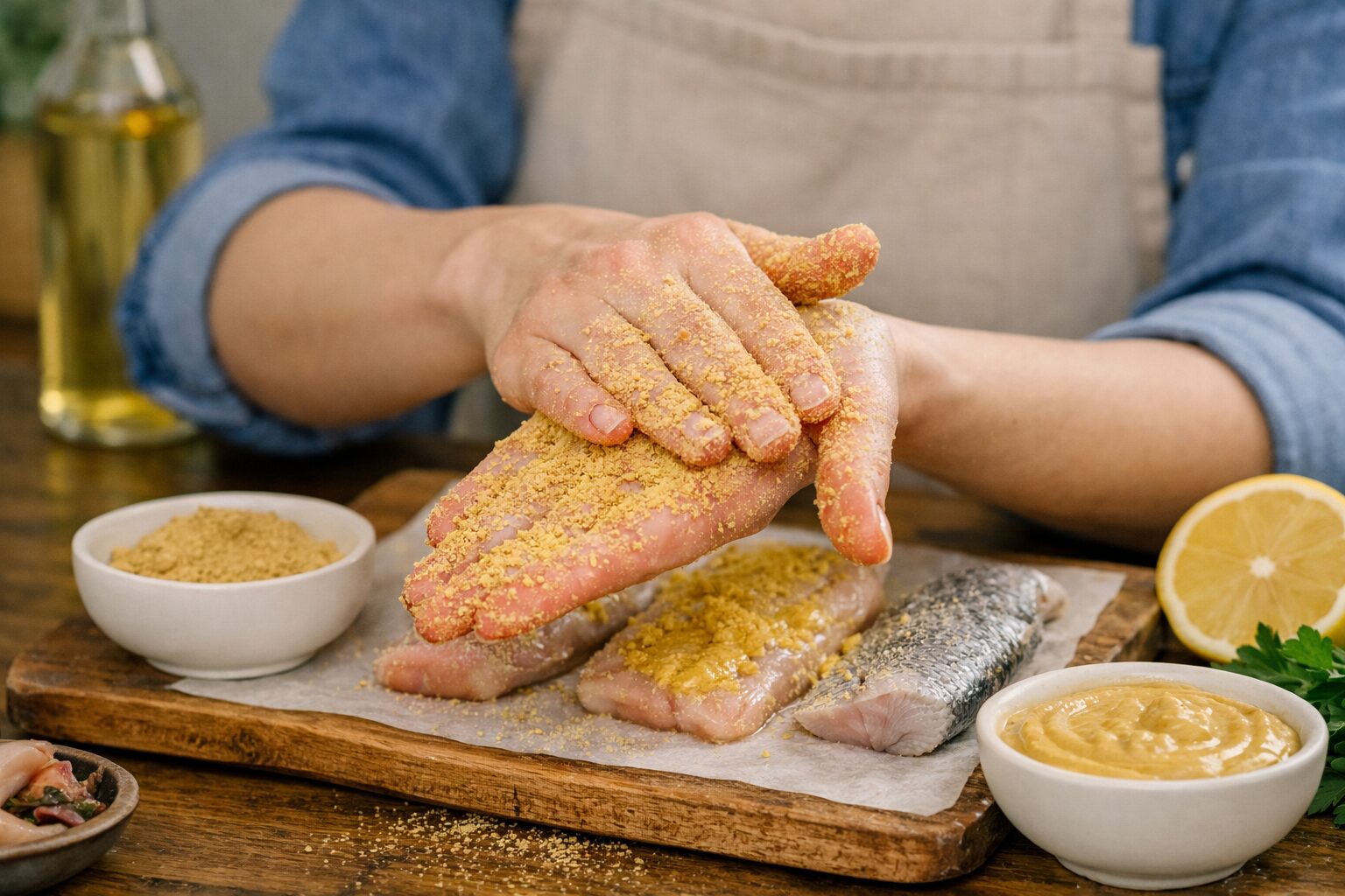 Розведіть 1 ст.лож. сухої гірчиці у невеликий кількості води. Має вийти кашка. Натріть нею шматки риби, підготовлені до кулінарної обробки. Заразом обробіть і посуд, в якому зберігався напівфабрикат.