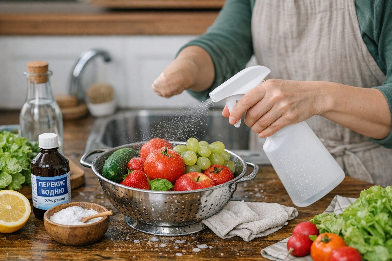 Аби позбавити покупну продукцію пестицидів, збризніть придбані на ринку чи в супермаркеті овочі та фрукти розчином перекису з водою в пропорції 1:1. Залиште у такому стані на 2 хвилини, потім промийте у великій кількості води.