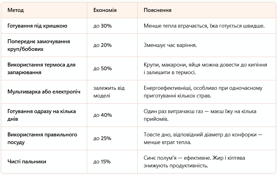 Якщо хочете отримати економію ще у 50%, тоді візьміть за правило не відразу ставити варити крупи, локшину чи яйця на газплиту, а спочатку запарити їх окропом у термосі. Ще краще скористатися мультиваркою чи електропічкою, якщо є світло. До того ж з’явиться можливість одночасно приготувати кілька страв.