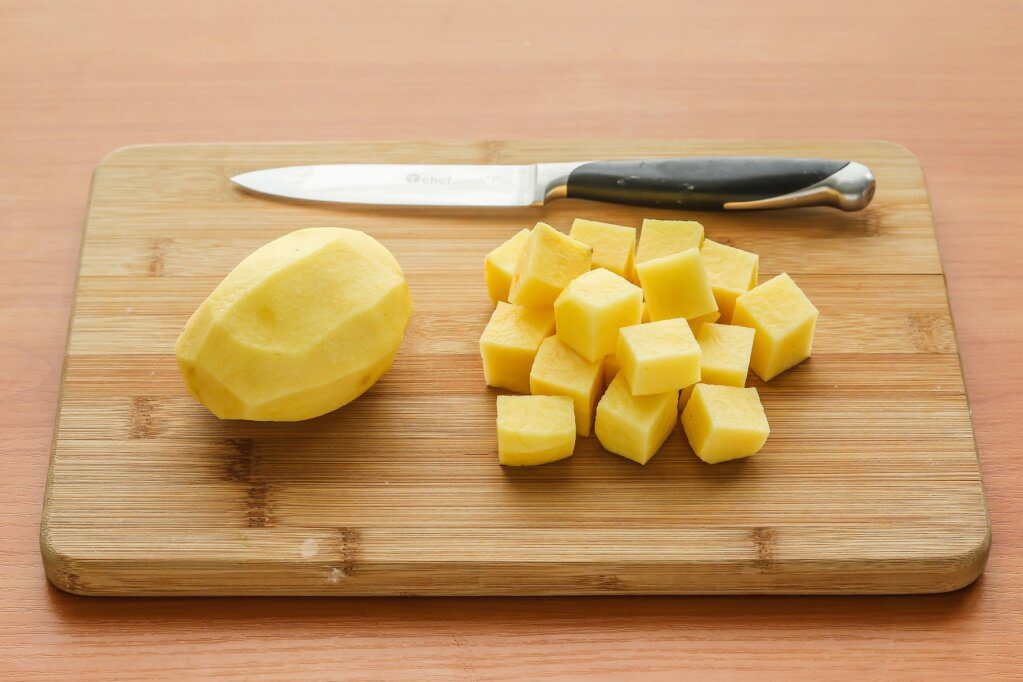 Щоб пюре вийшло смачним і ніжним, потрібно нарізати картоплю однаковими шматочками близько 2х2 см. Якщо зробити їх меншими, бульба вбере багато води й стане водянистою.