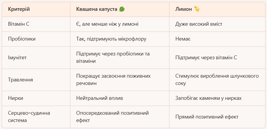 Квашену капусту можна назвати пробіотиком, а лимон такої властивості не має. Він є джерелом вітаміну С та належить до антиоксидантів. Тож у питаннях травлення та підвищення імунітету наш продукт набагато корисніший за заморський.